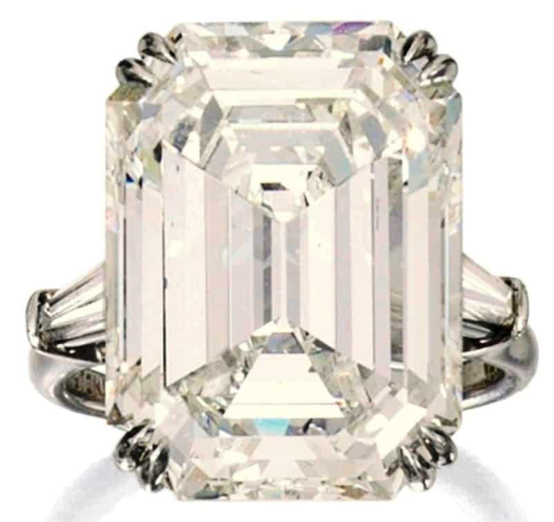 Lot 439 – A Platinum and Diamond Ring by Harry Winston – is another important piece from the Eydie Gorme collection. The ring incorporates an emerald-cut, J-color, SI1-clarity diamond weighing 17.40 carats as its centerpiece, flanked by two baguette-cut diamonds. A pre-sale estimate of US$ 350,000 – 450,000 was placed was placed on the lot, which was sold above the upper pre-sale estimate for US$ 569,000.